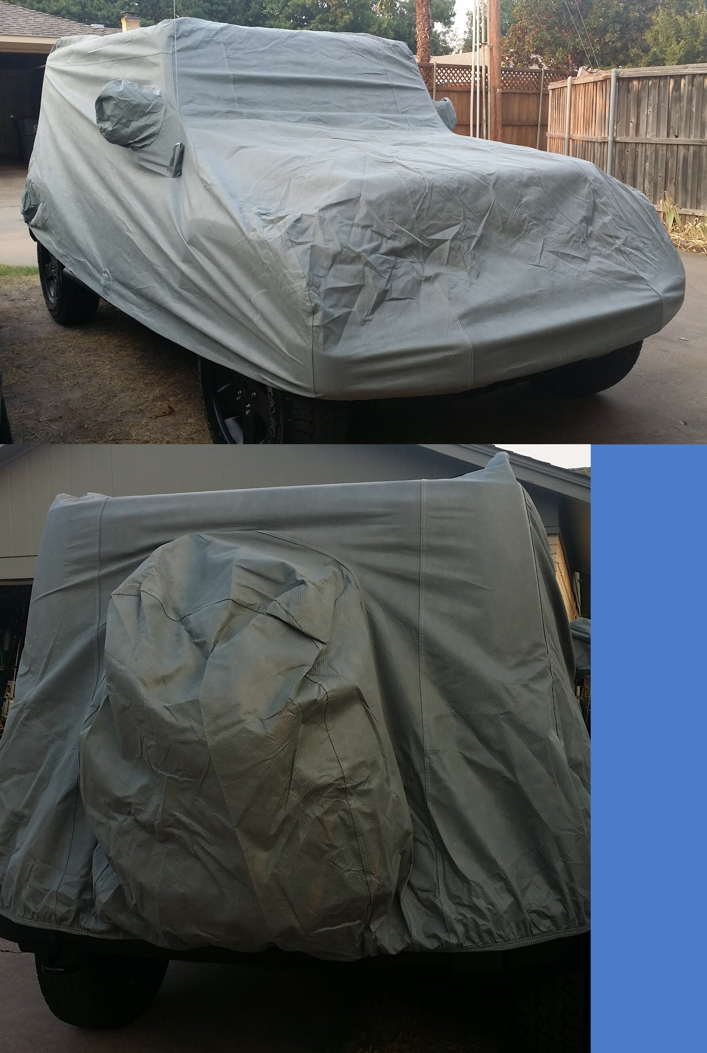 I received the cover the other day, but didn’t give it a trial fitting. Today I got around to it. It’s fine for my purposes. Right now the fore/aft dimensions are a little too tight for it to pull completely over the rear fender, but just barely so. I’m sure it will stretch a bit. It may even stretch and fit by morning. It’s got a nice little indent and hole for the antenna, which also makes it easy to orient when placing it on the Jeep. There’s enough slack that it should accommodate accessories around the body, if they don’t stick out too far.